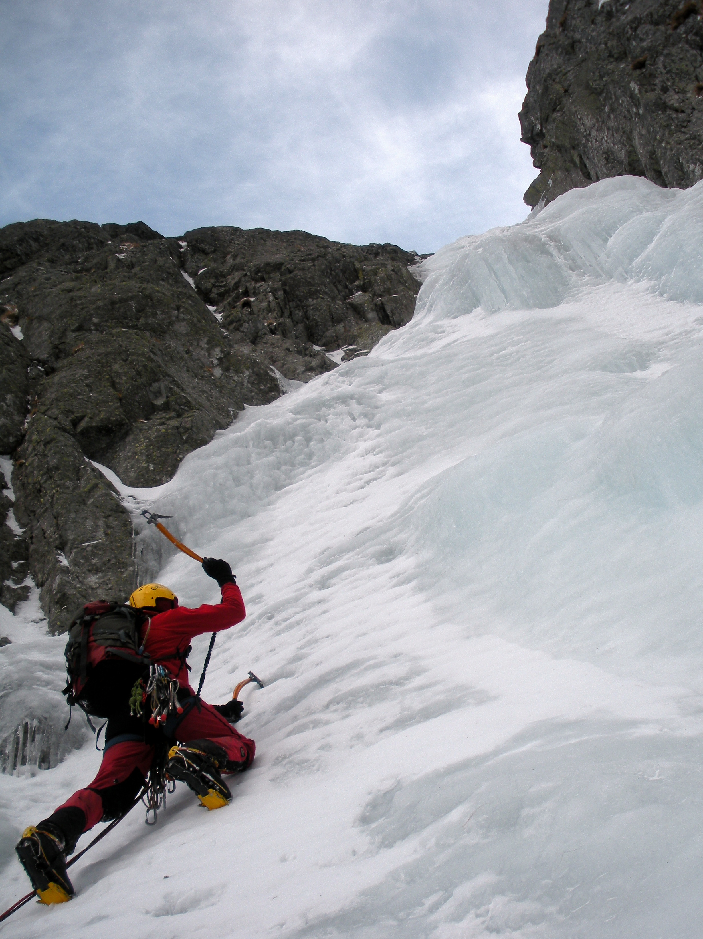 Wyruszamy z parkingu ponad 3 godziny przed wschodem słońca i już o 7:30 zjawiamy się pod pierwszym spiętrzeniem Doliny Śnieżnej. Decydujemy się na linię najmniejszego oporu i obchodzimy pierwszy lodospad Kozią Drabiną, pozornie łatwym terenem orograficznie na lewo od lodu. Zamiast oczekiwanej szerokiej półki, która miała doprowadzić nas bez wspinaczkowego trudu do Wielkiej Strągi, znajdujemy system niewielkich rzęchowatych półeczek ze słabo trzymającymi trawami - przejście atrakcyjne dla kozic, ale nie dla taternika w tępych rakach. Nie oszczędzamy nic a nic czasu, omijamy atrakcyjny z perspektywy zagruzowanego trawnika lodospad; po raz kolejny życie uczy nas, że nie warto iść na łatwiznę.