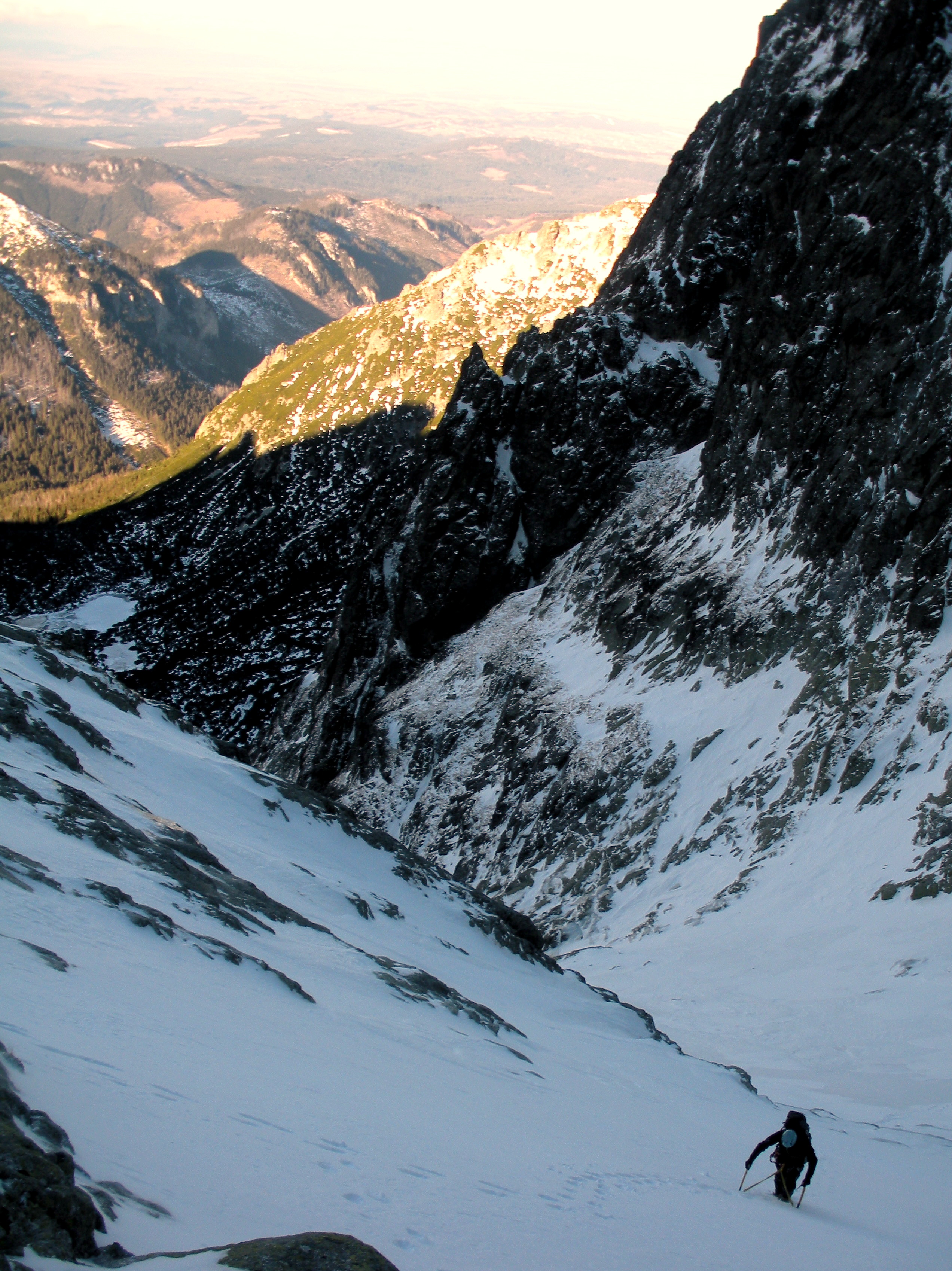 Koniec Wielkiej Strągi osiągamy sprawnie. Piotrek niespiesznie pokonuje łatwiejszy, lewy wariant lodospadu prowadzącego do Srebrnej Strągi i po krókiej przerwie konsumpcyjnej ruszamy dalej. Wspinanie jest przyjemne, po betonach i dobrze związanym śniegu. Ze Złotej Strągi kontunuujemy w lewo, Zielonym Korytem w stronę Śnieżnego Zwornika. Początkowo łatwy teren staje się coraz bardziej stromy. Przed niewielkim prożkiem decydujemy o związaniu się i do Zwornika idziemy na lotnej. Na grań wychodzimy chwilę przed zmrokiem.