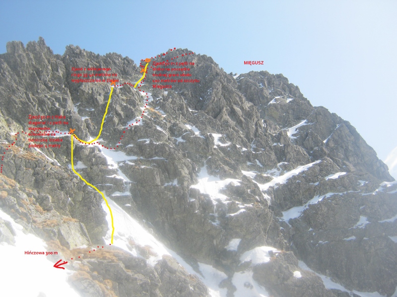 Ten opisany wariant przez Żelazko znacznie redukuje zagrożenie lawinowe, które jest na paskudnej Małej Galerii Cubryńskiej - tą galerię po protu omijacie. Nie jest wcale dłuższy ten wariant, bo z Zadniej Galerii też trzeba podejść do góry 70 m - w tej chwili są mocno przedeptane ślady z Wielkiej Galerii na Żelazko. Jeżeli planujecie zimowe drogi na Mięguszu to warto pójść na początek na łatwiejszą drogę i po prostu nauczyć się tego zejścia, bo po wyrypie się Wam nie będzie chciało szukać tylko pójdziecie na Małą Galerię Cubryńską (do której zejście też nie jest łatwo znaleźć po ciemku - błądziłem 2 godziny w 6 osób a nawigował nas Cywiński). Wręcz można pójść na Zachodnią Cubryny na Komin Bracha 2-3-kowy jeden wyciąg a potem na północno zachodnią ścianę Mięgusza 2-3-kowe 3 wyciągi i zacykać sobie w ten sposób zejście, żeby potem po północnej, najczęściej po ciemku i na zmęczeniu dokładnie wiedzieć co robić i gdzie.