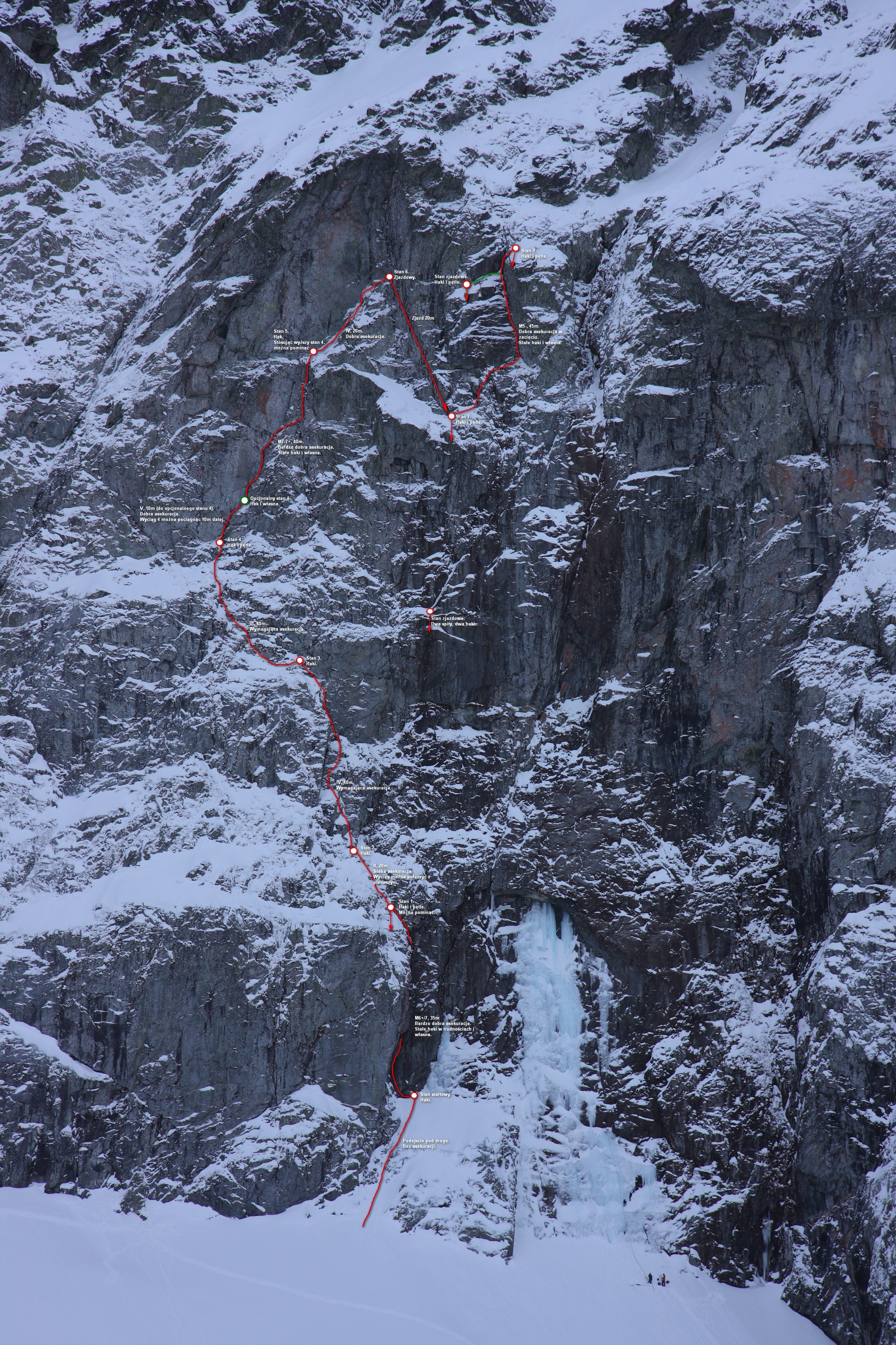 Pierwsza część to wspinanie w lodzie (WI3-4). Dwoma wyciągami można dostać się do śnieżnego kotła. Dalej po śniegu i przez jeszcze jeden łatwy próg lodowy należy podejść pod górną, mikstową część drogi. Zaczyna się ona krótkim progiem lodowym (WI2-3), a dalej wiedzie już skałami poprzetykanymi trawkami.