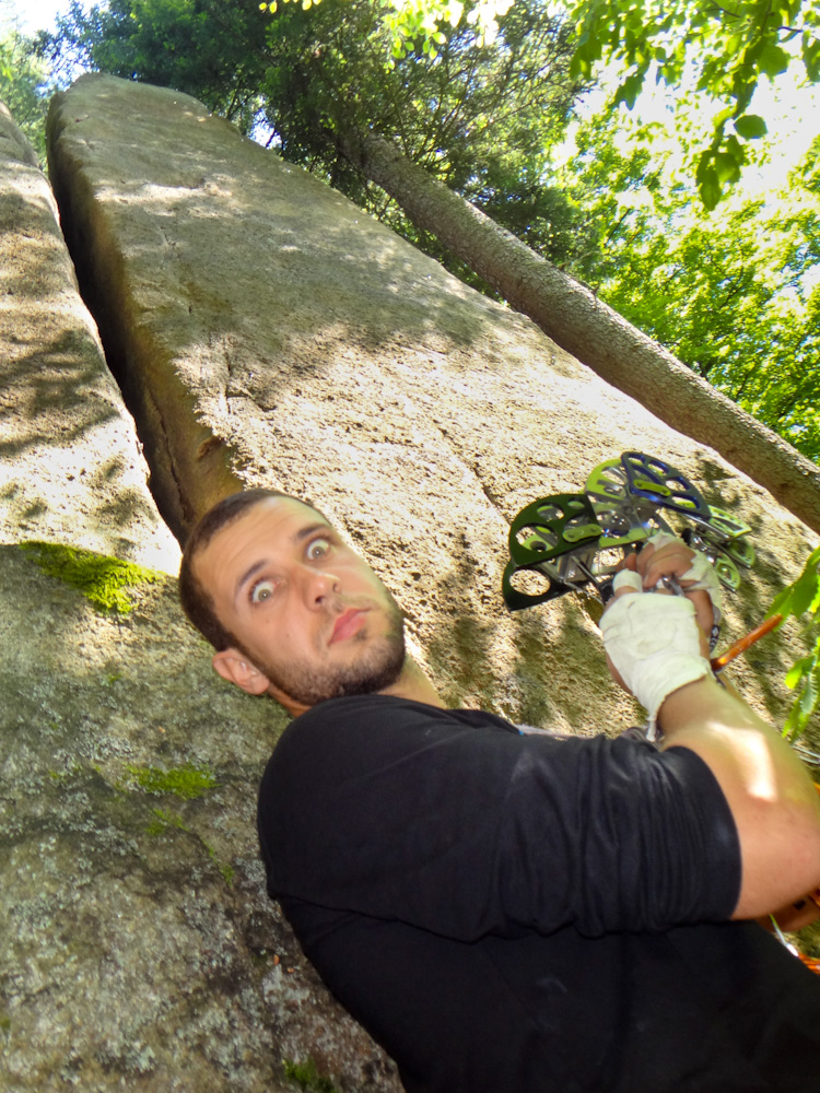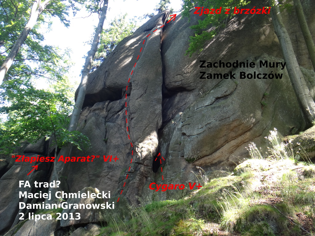 Po rozgrzewce na ciekawej drodze Włodka Porębskiego "Cygaro", atakujemy upatrzoną wcześniej linię startującą kilka metrów na lewo. Drogi nie ma w przewodniku, czujemy więc zew przygody i niepewność znaną każdemu eksploratorowi. Nie bez walki robimy drogę, obaj w pierwszej próbie. Jak się okazuje po konsultacjach z kustoszem rejonu Micajem, jest to najprawdopodobniej pierwsze jej przejście - w ten sposób stajemy się autorami nowej, ciekawej linii w Rudawach Janowickich. Drogę nazywamy "Złapiesz Aparat?", nawiązując do przejścia Damiana, który w trudnościach uświadomił sobie, że w kieszeni ma aparat fotograficzny. Próba zrzucenia aparatu nie przebiegła zgodnie z zamierzeniem: