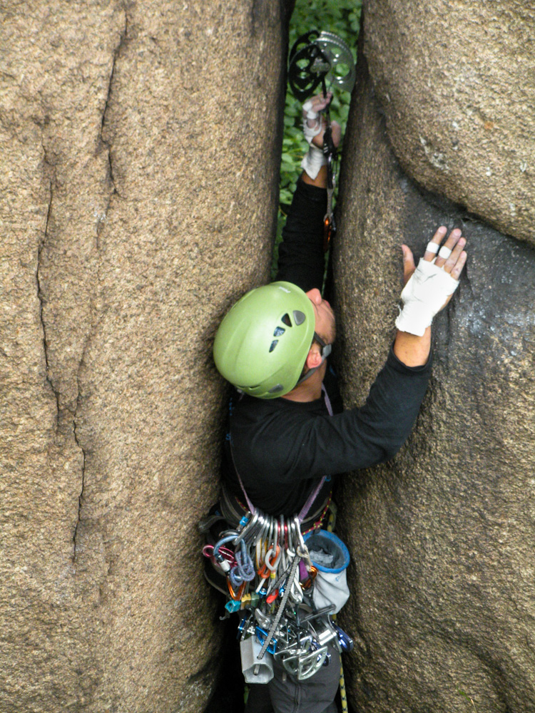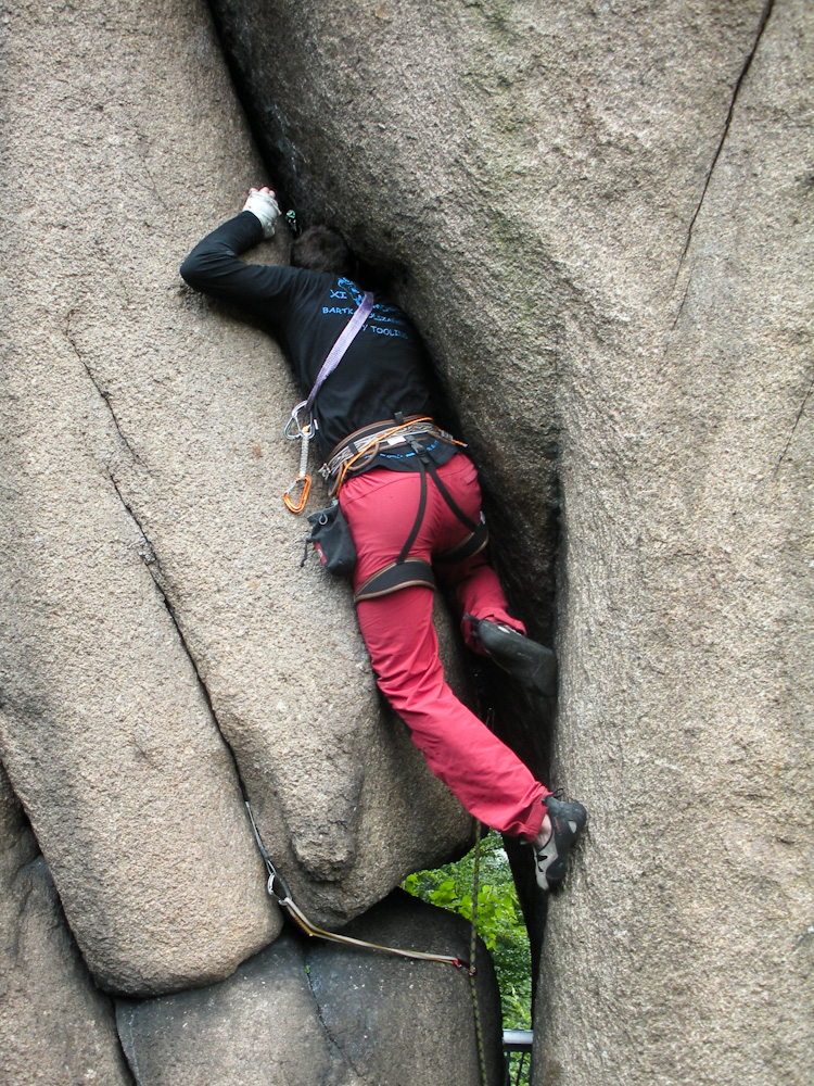 Obwieszony niczym choinka wielkimi friendami wciskam się w ciasną przerysę i "mknę" do góry. Damian dla dodania mi motywacji informuje mnie, że "w przerysach się nie odpada, przerysy się odpuszcza". W chwilach zwątpienia słyszę słowa innej wspinaczkowej mądrości: "Idź jak glizda, nie bądź...". Udaje mi się dopełznąć do trudności, a nawet trochę wyżej. Stojąc niezbyt pewnie, o krok od klam szczytowych, wiedziony instynktem samozachowawczym, postanawiam założyć jakąś asekurację. Siada malutki Dragonik... po czym równie szybko zostaje wyrwany z kruchej skały. Lot szczęśliwie skończył się metr nad glebą. Lina miała mniej szczęścia, oplot został zerwany niemal na całej pracującej długości.