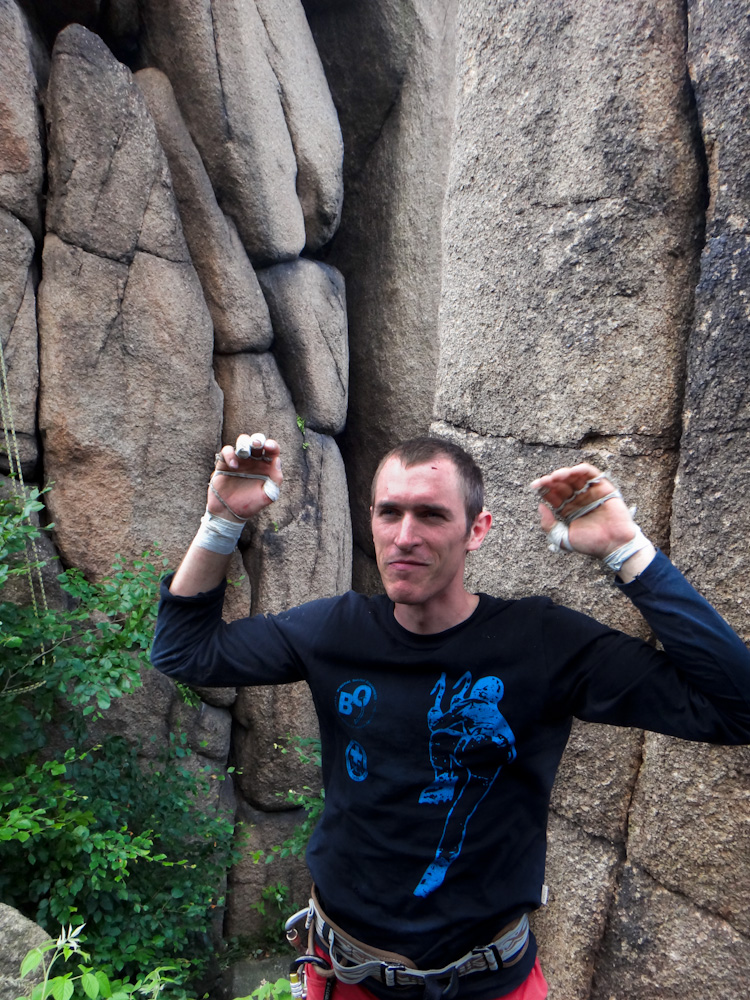 Kolejne dni mijają w rytmie odmierzanym przez wymuszone przez Damiana pobudki o 6 rano, zmienną pogodę, popołudniowe obnoszenie się z ranami odniesionymi danego dnia oraz wieczorne ogniska w towarzystwie obozu wspinaczkowego dzieciaków z Poznania. W dni gorszej pogody udajemy się na sportowe wspinanie na Tępej (skała bardzo dobra na deszczowe dni, przewieszona i niemal całkowicie osłonięta od opadów) oraz na Sukiennicach. Szybko stwierdzam jednak, że chwilowo jestem bez formy na sportowe drogi, chociaż słowa chwilowo używam raczej z sympatii do samego siebie.