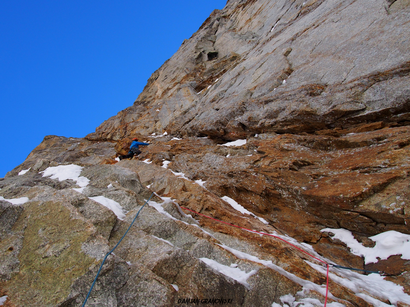 Desmaison 10-13 października 2017, Damian Granowski i Tomasz Klimczak. 3 biwaki w ścianie i jeden na wierzchołku. 1200 m, M6+, WI4, A1, R. Topo i opis drogi znajdziecie na winterclimb.com. Filmową relację z kolei tutaj.